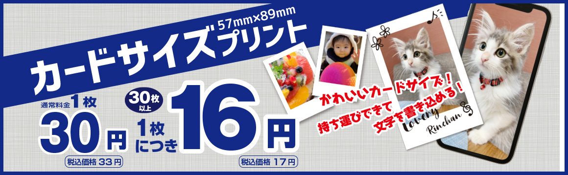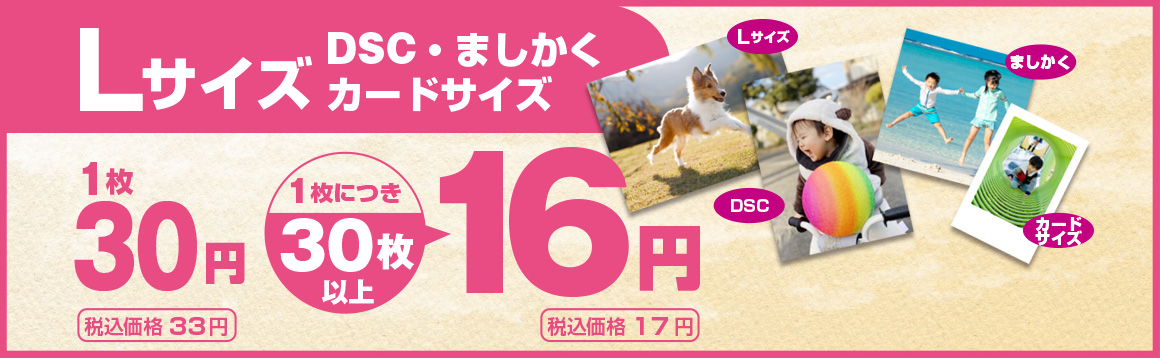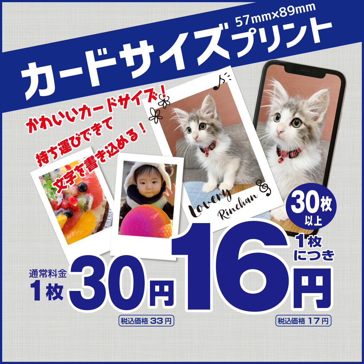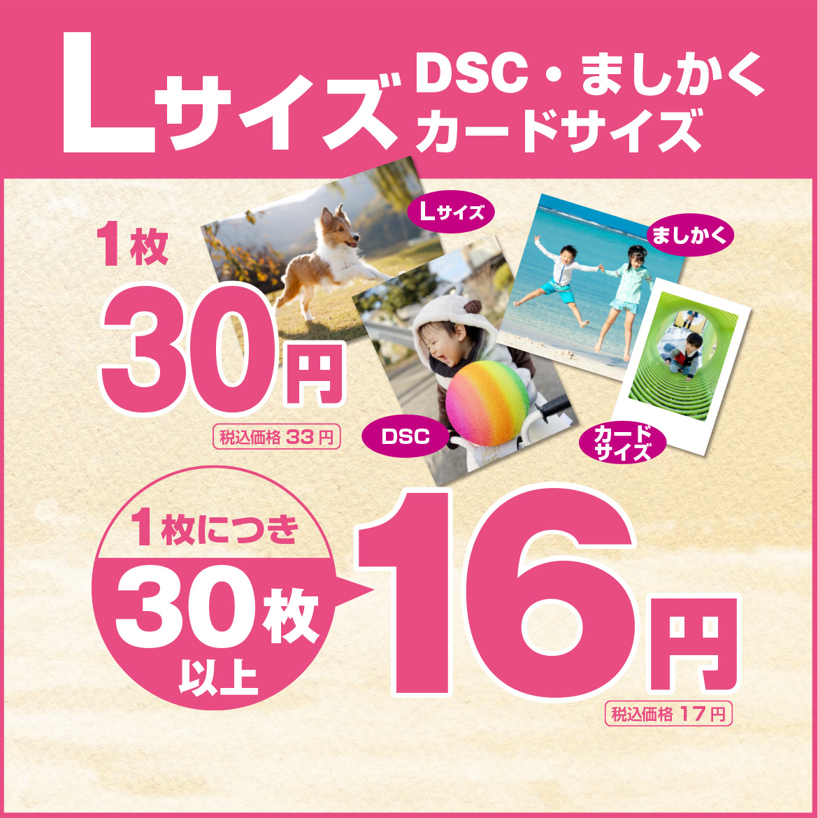 L・DSC・ましかく・カードサイズが、通常1枚33円のところ、50枚以上で1枚13円!とってもお得なキャンペーンです。お得なこの機会にぜひご利用ください! 12/15(月)~ 2026年 1/11(日)まで